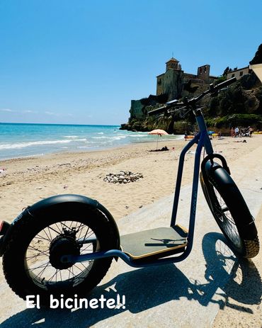 Este nuevo vehiculo llamado "bicinete" es un mix entre bicicleta y patinete que tiene una gran potencia para disfrutar de la playa o los mas complicado caminos de piedras y baches.